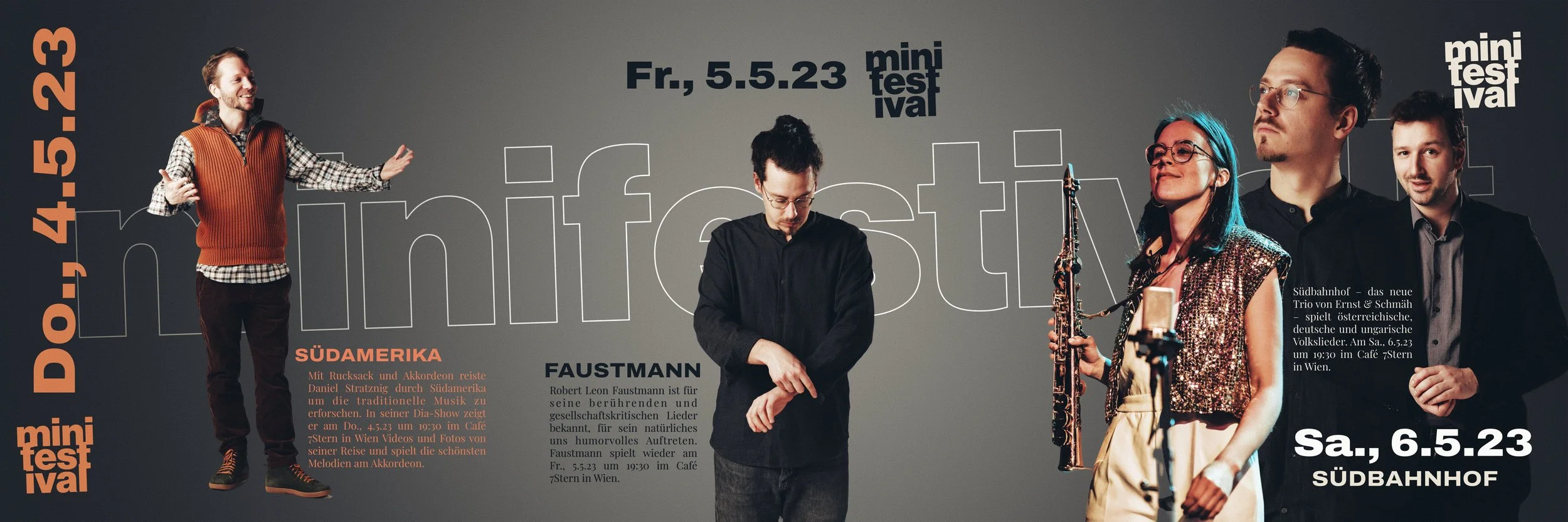 Das Minifestival hat bisher 43 Mal stattgefunden. Die Künstler:innen teilen sich die Bühne. Es kommt zu neuen Formationen und vielen überraschenden und spontanen Situationen während des bunten Konzertabends! Es ist ein Zusammentreffen der besten Musiker:innen aus Wien, Graz und Linz. Manchmal sind auch weitere Gäste aus den Bundesländern dabei. Man kann das Minifestival auch als Netzwerkveranstaltung für Top-Musiker:innen bezeichnen, oder als Liederabend für Singer-Songwriter:innen, die ihre neuesten Kompositionen präsentieren wollen.
